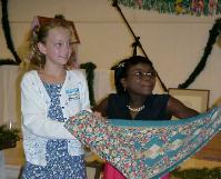 Daughter Jessica helps display a hand stitched table drape by her Mother Lynn Stevens and "Grandma" -- Lynn is one of the faithful who always brings something to the dinner to be auctioned off. |