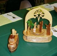 In addition to putting up the web site, helping with computer consulting, doing the job that earns his living and serving as Director -- Ed Stevens finds time to create beautiful wood pieces for the fundraiser. In 1999 there was a music box nativity scene, a tug boat and a truck. |