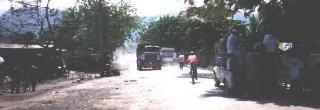 This photo captures the activity seen in the streets of the city on a slow day. There are street vendors, big trucks with no or bad brakes hauling heavy loads, people on bicycles (also with no brakes), and small pick up trucks with seats added to carry as many paying passengers as possible -- until the tires blow, the engine blows or the truck simply gives up!