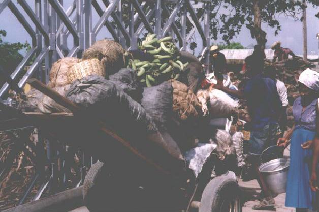 This cart is loaded down with goods being moved around the city for hire. The gray bags are usually charcoal, there is probably some bags of rice, you see the baskets of goods, bananas. They are heavy, the streets are very bad. The average working career of the men who work these carts is five years -- usually two, one under the handles at the front and another on the back pushing. By then they have severe hernias and other health problems that prevent them from working any more. Five years of heavy labor and you are done.