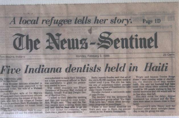 There are some times that it gets more exciting than others. Like the time we had a full dental team in Terrier Rouge and the hotel sent a runner out to the village to tell us that we all had to go back to the hotel. We broke down the clinic, packed up the supplies and went back. This was during the coup of 1986. The airports were closed and no one was allowed to leave the hotel. The always remembered smell of gun powder wafting across your patio lunch table, guards outside while the team members enjoyed the pool, tested out their new camera equipment and generally had a great time. But back home the wives had panicked and as the unknown grew in the imaginations, the team was greeted at home like heroes and this was the Ft. Wayne headlines. Someone else had a team member who was totally out of control so Don gave up his seat, on his birthday, and stayed behind as the last plane flew out with the team.